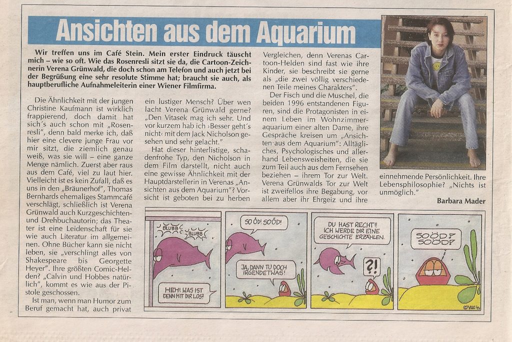 Der erste Comic „Ansichten aus dem Aquarium“ hat im Dezember 1996 das Licht der Welt erblickt. Ihm folgten bald jede Menge weiterer 4-Panel Cartoons, die von 1998 bis 2001 in der „NÖN-Niederösterreichische Nachrichten“ und dem „ Wiener Blatt“ veröffentlicht wurden.