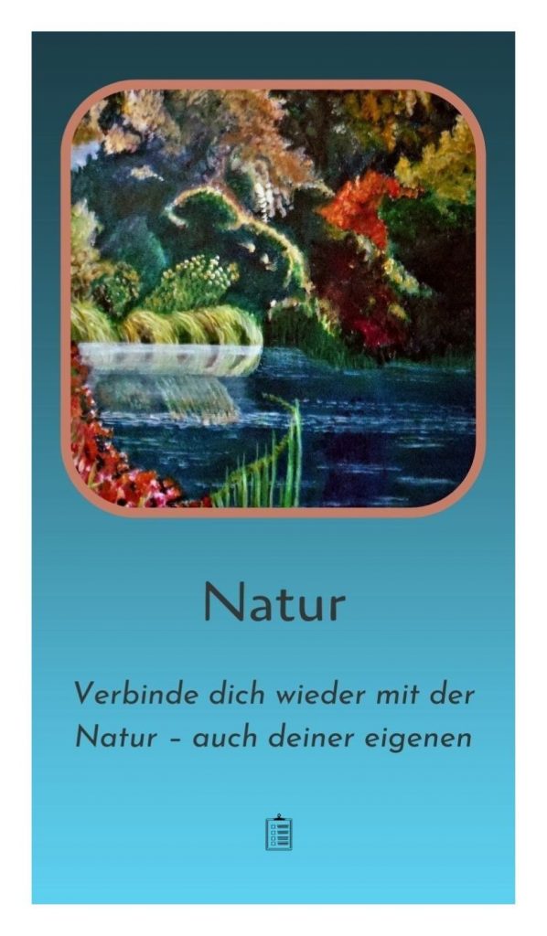 Diese Karte möchte dich daran erinnern, wie wichtig es gerade jetzt ist, mehr Zeit in der Natur zu verbringe, denn dort kann es viel leichter passieren, dass du die Antworten auf deine Fragen findest, weil du besser denken und dich leichter fühlen kannst. Auch hält die Natur unschätzbare Lektionen über Fülle bereit, durch ihre unglaubliche Vielfältigkeit, ihren Überfluss und ihre natürliche Pracht. Lass dies alles auf dich wirken und erkennen wieder deine wahre Größe und deine eigene Natur in dieser wahren Üppigkeit von göttlicher Vielfalt.