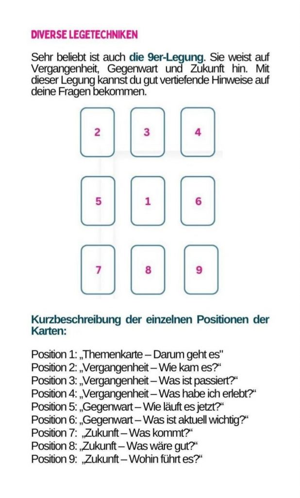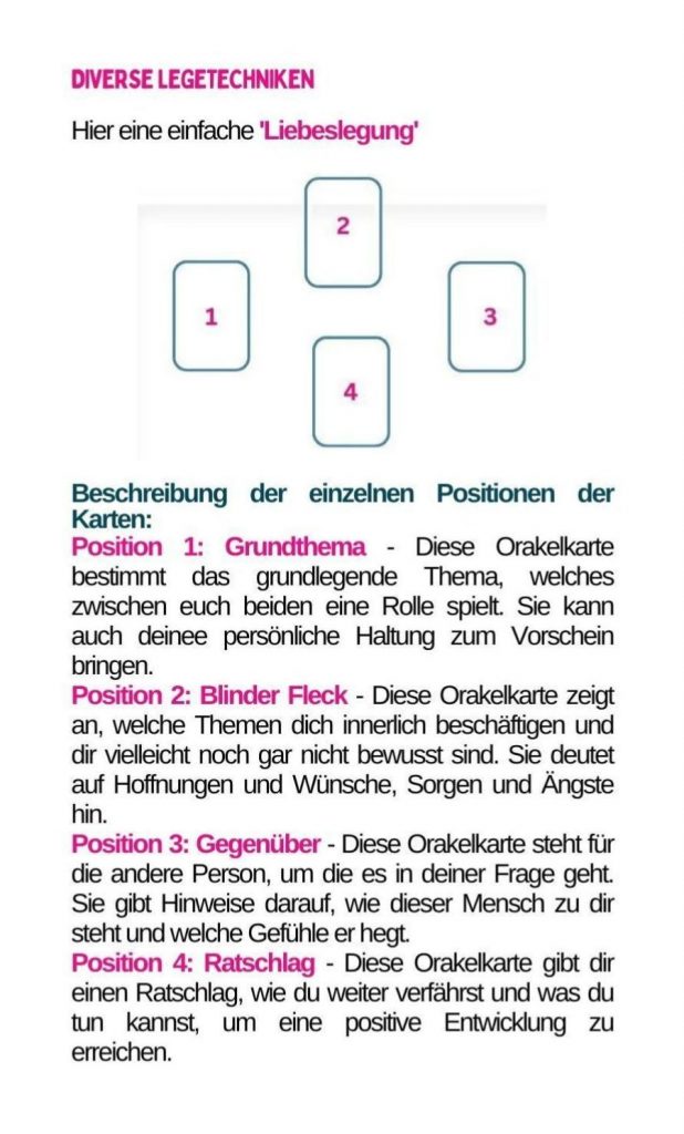 Sie eigent sich besonders gut, wenn due eine Frage stellen möchtest. (ACHTUNG: KEINE Frage, die mit Ja oder Nein zu beantworten ist) Zu Liebesfragen verwende das Liebesdeck und ergänze es eventuell mit den anderen Decks für tiefergreifende Erklärungen. Für Fragen zu Beruf oder andere spezielle Themen verwende das Tätigkeitsdeck. Möchtest du eine Frage zu deiner allgemeinen Situation stellen, verwende entweder das gesamt Deck oder nur das Liebes- und Tätigkeitsdeck und kläre mit den Botschaftskarten einzelne Karten, bei denen du weiterführende Vertiefung benötigst.