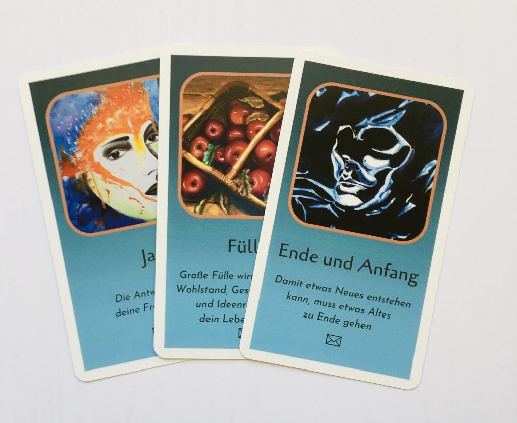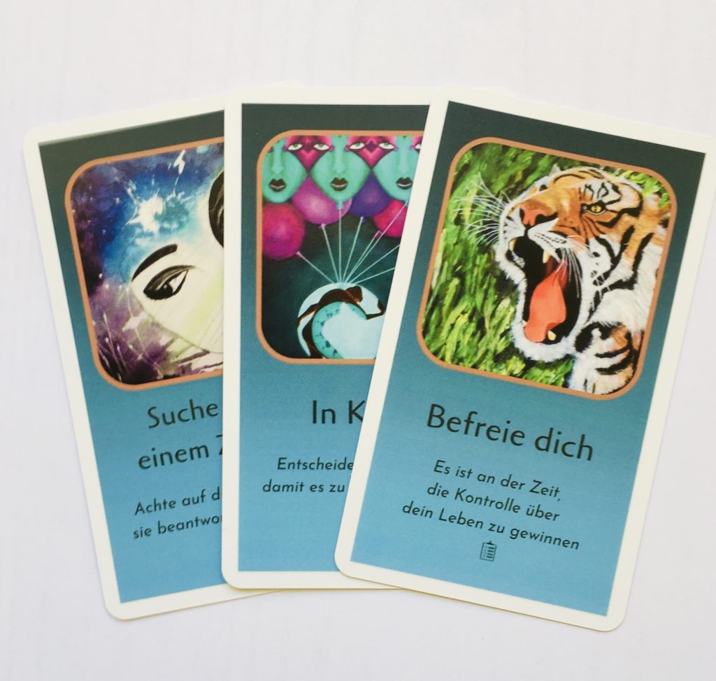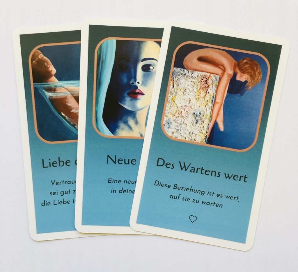 Dieses Kartendeck habe ich entwickelt, damit man mit einem Deck gleich mehrere Themenbereiche ‚bearbeiten‘ kann. Es besteht aus 10 Botschaftskarten, 24 Tätigkeitskarten und 30 Liebeskarten.