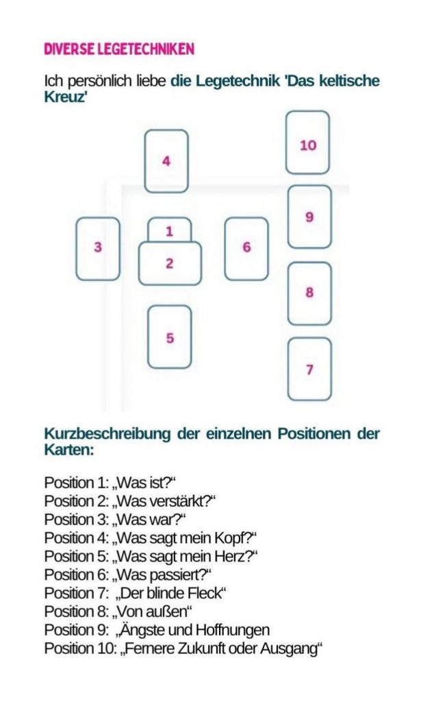 Diese Legetechnik – eine meiner absoluten Favoriten – wird für alle Themenbereiche verwendet und gibt Hinweise auf die Vergangenheit, die Gefühls- und Gedankenebnee, die nähere und fernere Zukunft udn den blinden Fleck. Hierzu rate ich alle Karten zu verwenden, außer du willst speziell eine Liebeslegung machen, dann verwende nur das Liebesdeck zusammen mit den Botschaftskarten. Du kannst dann immer noch die einzelnen Karten mit den Tätigkeitskarten weiter vertiefen.