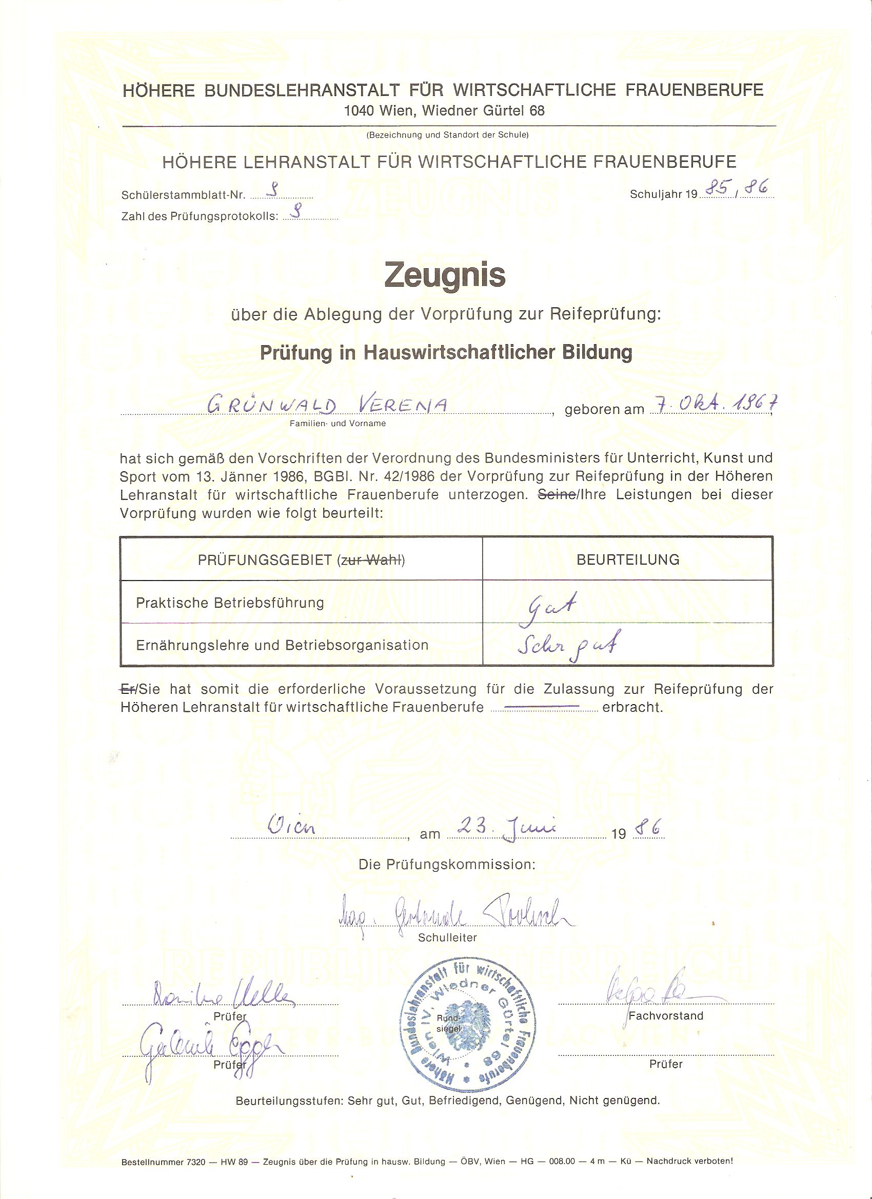 Studium BWL MagisterbescheidBeleg für Center of Excellence WU WienMaturazeugnis Zeugnis Fachprüfung Hauswirtschaftliche BildungKonzenssionsprüfung für Gastronomie und HotellerieGewerbeschein Handel und HandelsagentArbeitszeugnis MaPitomZeugnis Praktika Espresso im RegierungsgebäudeZegnis Praktikum Hotel am Stephansplatz